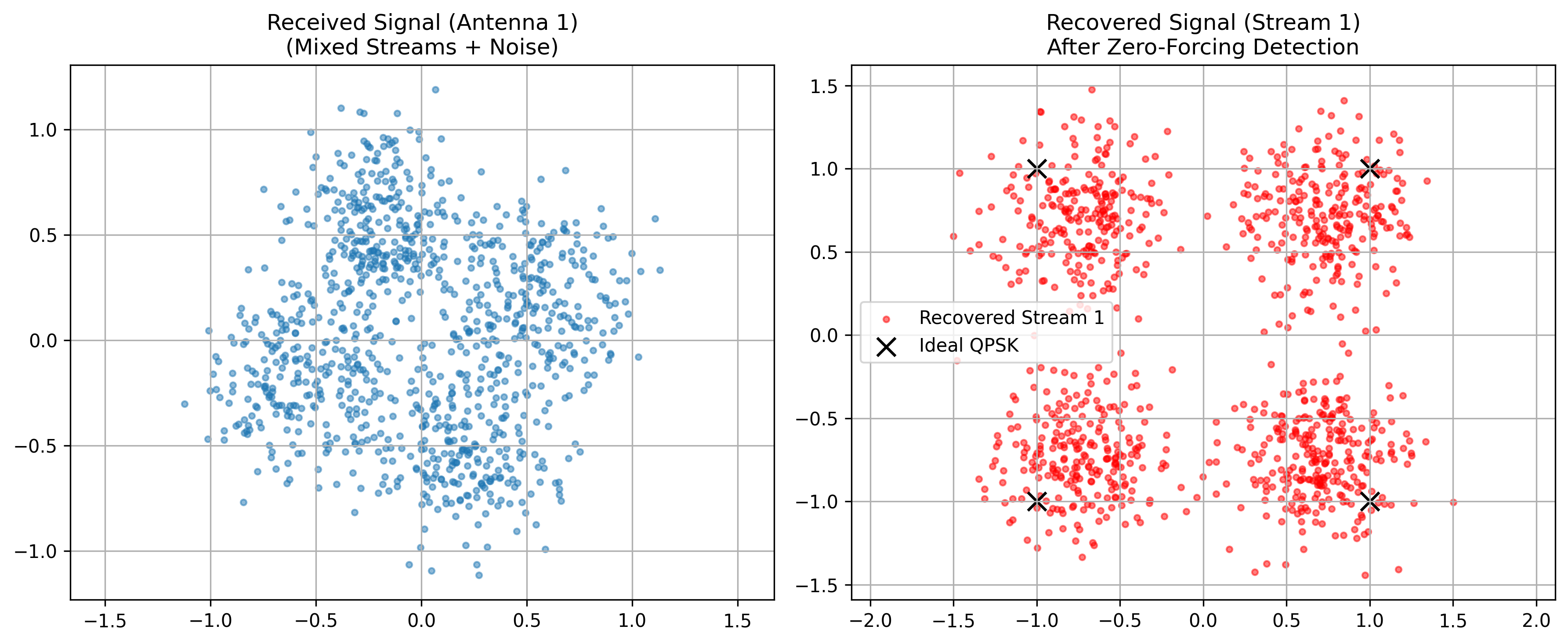 - Advanced Physical Layer: Implemented multi-scheme modulation (BPSK/QPSK) and a $2 \times 2$ MIMO system with Zero-Forcing detection, doubling spectral efficiency while handling Rayleigh Fading and AWGN channel noise.